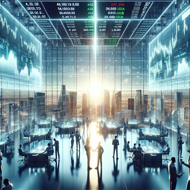 User prompt: Please respond with an image generation prompt that would be likely to create an interesting visual using DALLE-3, using the following style: [ High-tech ] and depicting this scene: Amidst the clear blue skies of Phoenix, a bustling stock exchange office is brimming with excitement. The ORIX Corporation's stock price ticker tape is ablaze with green numbers, indicating a significant surge. Investors are seen high-fiving and cheering as they bask in the newfound success, linking the clean air of the city with the fresh optimism surrounding the company's stock. Keep the visual depiction simple. Do not include any words or speech bubbles.