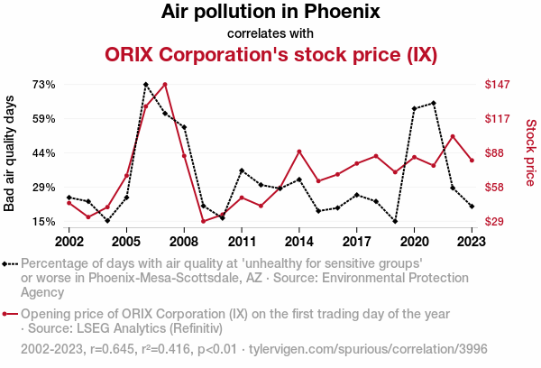 - The spurious research paper: Smogonomics: Unveiling the Aerial Dance of Air Pollution in Phoenix and ORIX Corporation's Stock Price