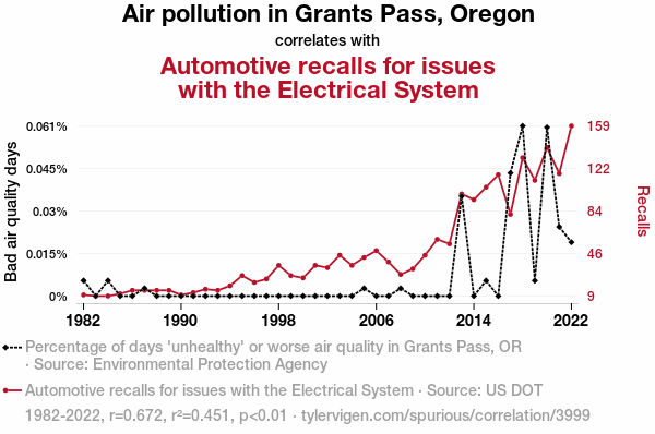 - The spurious research paper: Electrical System Recalls: A Shocking Correlation with Air Pollution in Grants Pass, Oregon