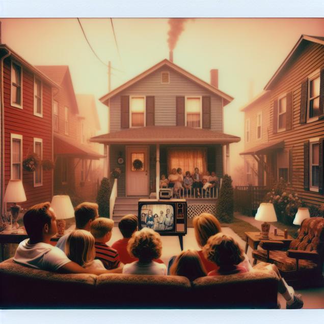 ChatGPT: Create an image of a Polaroid photo capturing the essence of Effingham, Illinois. The sky is tinged with a hazy pollution that filters the sunlight as families gather in their living rooms for solace. The focus of the image is on a family cozily huddled together, engrossed in watching "Days of Our Lives" on television, portraying the shared experience and comfort found in these familiar surroundings.