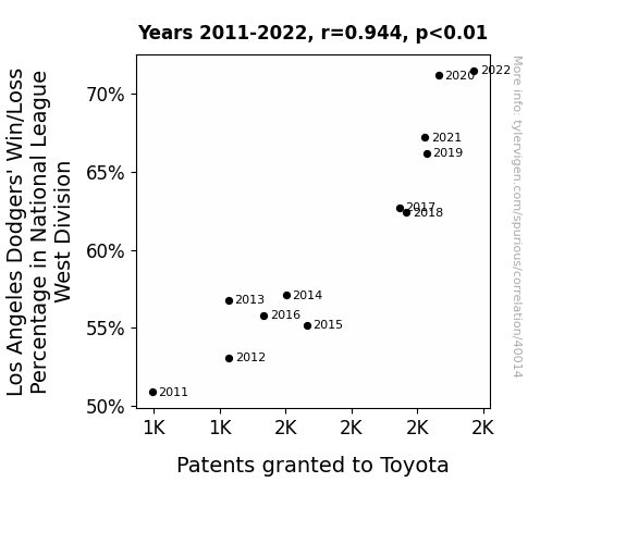 This means 89.1% of the change in the one variable (i.e., Patents granted to Toyota) is predictable based on the change in the other (i.e., Los Angeles Dodgers' Win/Loss Percentage in National League West Division) over the 12 years from 2011 through 2022.