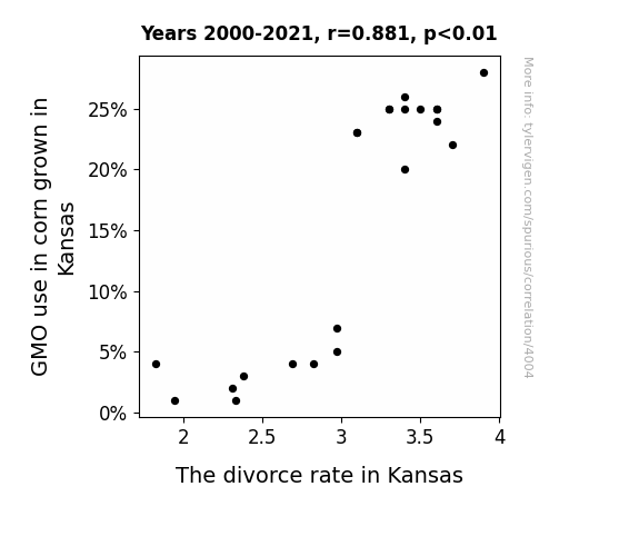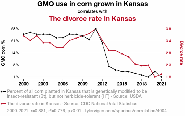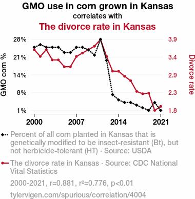 This means 77.6% of the change in the one variable (i.e., The divorce rate in Kansas) is predictable based on the change in the other (i.e., GMO use in corn grown in Kansas) over the 22 years from 2000 through 2021.