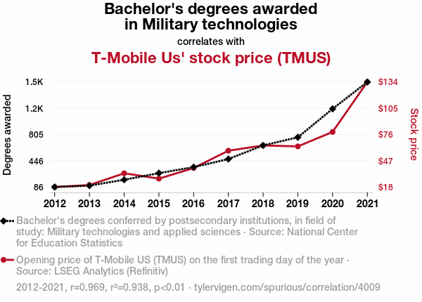 User prompt: Please make up a funny explanation for how an increase in Bachelor's degrees awarded in Military technologies and applied sciences caused T-Mobile Us' stock price (TMUS) to increase.