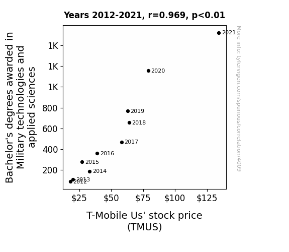 This means 93.8% of the change in the one variable (i.e., T-Mobile Us' stock price (TMUS)) is predictable based on the change in the other (i.e., Bachelor's degrees awarded in Military technologies) over the 10 years from 2012 through 2021.