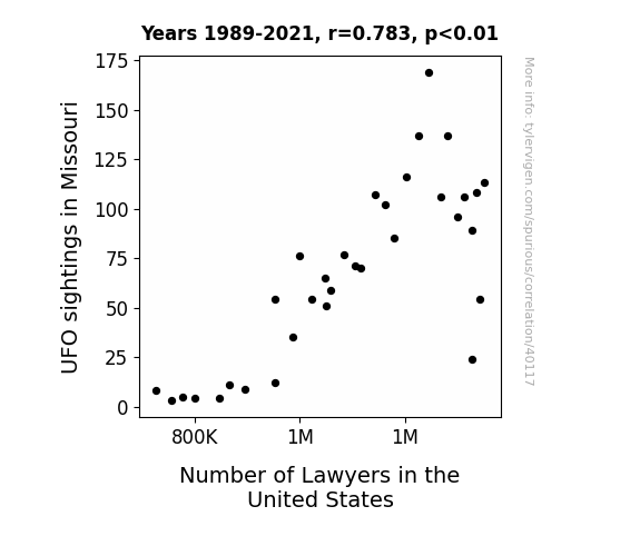 This means 61.3% of the change in the one variable (i.e., Number of Lawyers in the United States) is predictable based on the change in the other (i.e., UFO sightings in Missouri) over the 33 years from 1989 through 2021.