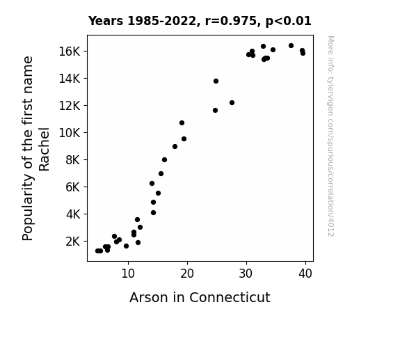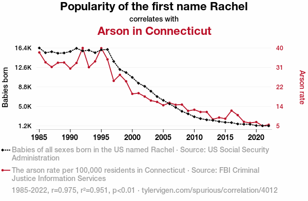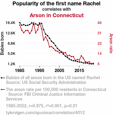 Rachel, arson, correlation, Connecticut, US Social Security Administration, FBI Criminal Justice Information Services, 1985-2022, correlation coefficient, psychology, sociology, moniker, pyromania, Nutmeg State