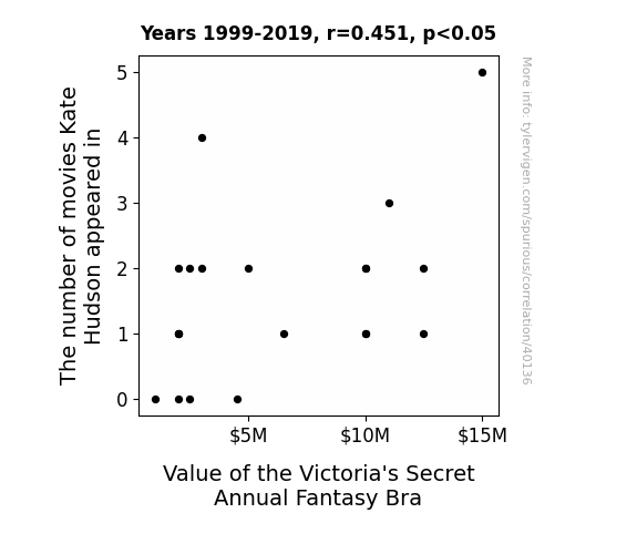 This means 20.4% of the change in the one variable (i.e., Value of the Victoria's Secret Annual Fantasy Bra) is predictable based on the change in the other (i.e., The number of movies Kate Hudson appeared in) over the 21 years from 1999 through 2019.