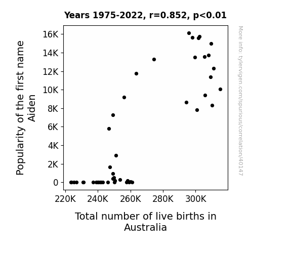 This means 72.6% of the change in the one variable (i.e., Total number of live births in Australia) is predictable based on the change in the other (i.e., Popularity of the first name Aiden) over the 48 years from 1975 through 2022.