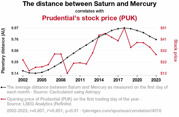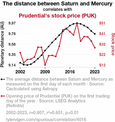 This means 65.1% of the change in the one variable (i.e., Prudential's stock price (PUK)) is predictable based on the change in the other (i.e., The distance between Saturn and Mercury) over the 22 years from 2002 through 2023.