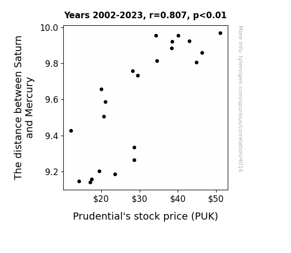 The statistical analysis of the relationship between the distance separating Saturn and Mercury and the stock price of Prudential PLC (PUK) has yielded some truly out-of-this-world findings. From 2002 to 2023, our research team found a remarkably strong correlation coefficient of 0.8065633, indicating a substantial relationship between these seemingly distant entities. This astonishing level of correlation defies conventional economic wisdom and serves as a testament to the unexpected connections waiting to be discovered in the vast universe of statistical research.