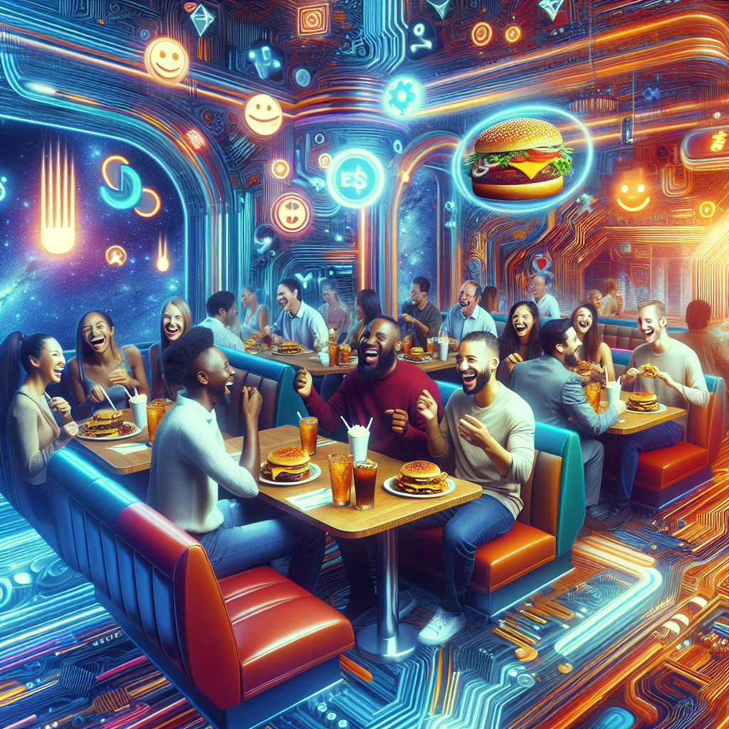 ChatGPT: Generate an image of a bustling diner with a futuristic high-tech style. The diner should be filled with happy customers enjoying mouthwatering cheeseburgers and grilled cheese sandwiches. In the background, display a stock ticker showing BlackRock's stock price rising steadily amidst a backdrop of smiling investors.