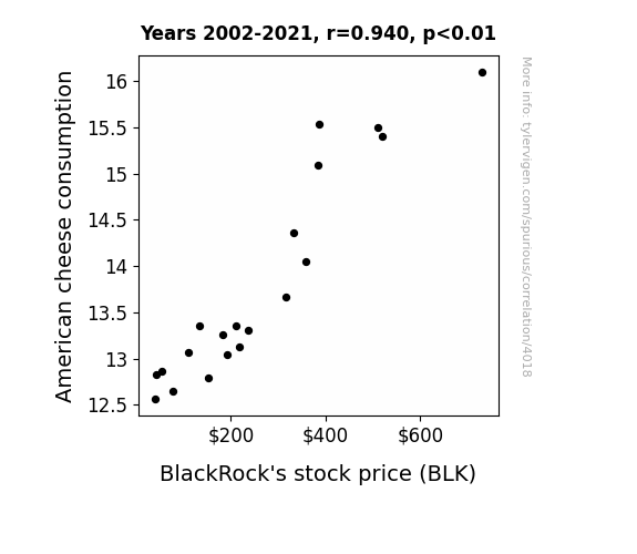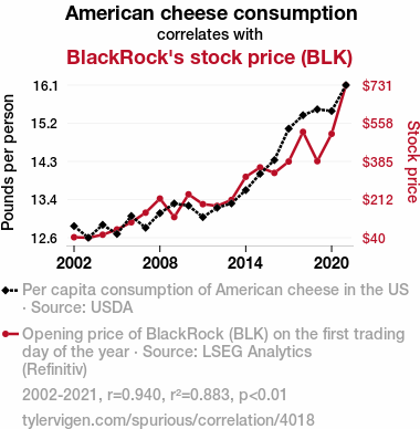 - The spurious research paper: Cheddar and Cheddar: The Cheesy Connection Between American Cheese Consumption and BlackRock's Stock Price