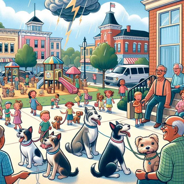 Prompt: [ Cutesy art illustration ] An enchanting scene unfolds in a bustling Ohio town as a group of enthusiastic animal scientists gathers at a seminar to discuss the behavioral patterns of pets named Stormy. Outside, a vibrant playground is filled with children calling out to their pets, including several dogs named Stormy. Amid the excitement, the dogs are led indoors, and the scientists watch closely, eager to study their reactions to the upcoming thunderstorm. The illustration captures the joyous atmosphere of the town and the curious nature of the animal scientists as they prepare to observe the pets' reactions. The depiction should include only scenes, people, and objects, it should not include text or speech bubbles.