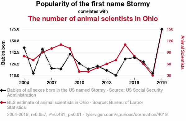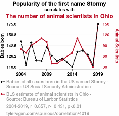 Parents naming their children Stormy were unknowingly participating in a secret government experiment to raise a generation of weather-controlling prodigies. These Weather Wizards™ had a natural affinity for understanding the atmospheric conditions, leading to a surge in demand for animal scientists in Ohio who were trying to figure out why there were suddenly so many unexplained rain showers at the local farms. It's a storm of a coincidence, but the forecast for animal science in Ohio has certainly taken an unexpected turn!