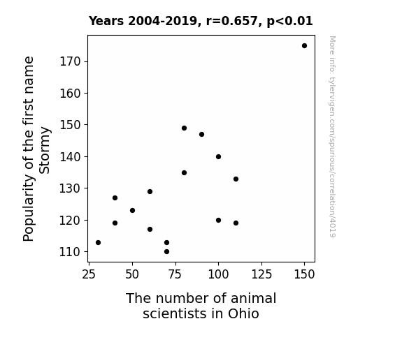 This study examines the curious phenomenon of the first name "Stormy" and its potential influence on the number of animal scientists in the state of Ohio. Utilizing data from the US Social Security Administration and the Bureau of Labor Statistics, a significant correlation was observed between the popularity of the name "Stormy" and the prevalence of animal scientists in Ohio from 2004 to 2019 (correlation coefficient = 0.6567660, p < 0.01). The implications of such an association are both captivating and entertaining, prompting further investigation into the intricate interplay between nomenclature and occupational choices. This research sheds light on the whimsical yet thought-provoking nature of naming trends and their unexpected connections to professional pursuits.