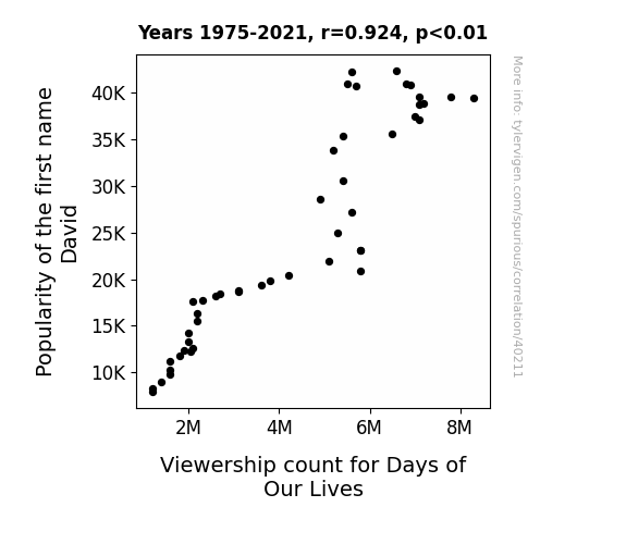 This means 85.4% of the change in the one variable (i.e., Viewership count for Days of Our Lives) is predictable based on the change in the other (i.e., Popularity of the first name David) over the 47 years from 1975 through 2021.