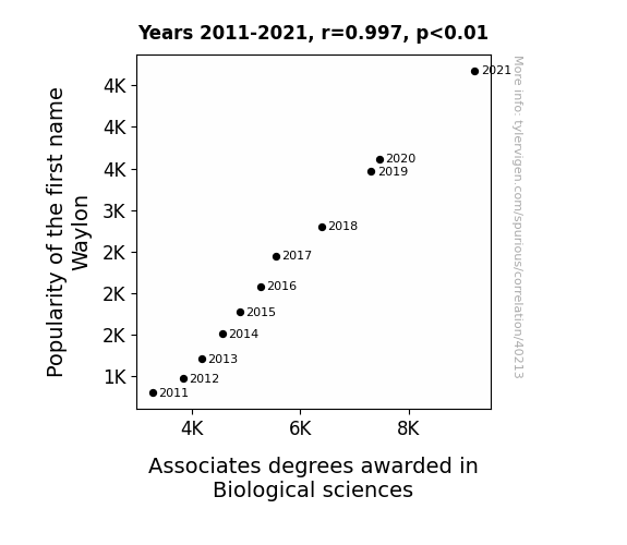 This means 99.4% of the change in the one variable (i.e., Associates degrees awarded in Biological sciences) is predictable based on the change in the other (i.e., Popularity of the first name Waylon) over the 11 years from 2011 through 2021.