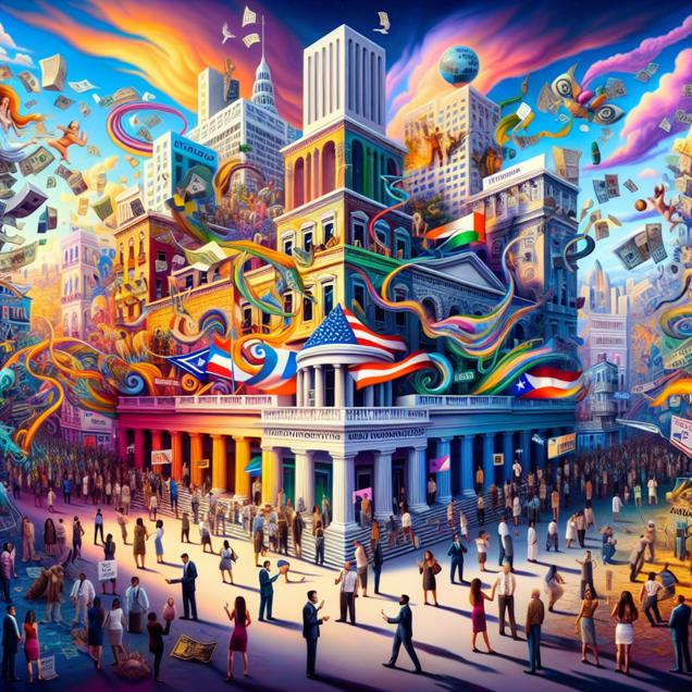 Prompt: The visual depicts a vibrant Puerto Rican cityscape, bustling with activity and color. At the forefront are a multitude of interpreters and translators, their figures blending seamlessly with the surroundings as if they are part of a lively dance. The atmosphere exudes a sense of motion and energy, reflecting the dynamic nature of language and communication. The interpreters and translators are depicted in a way that emphasizes their interconnectedness with the environment, visually representing the intricate web of communication. Their presence creates a mesmerizing visual pattern that weaves through the city, symbolizing the complexity of linguistic interactions. Amidst this scene, there is a focal point where the chaos of miscommunication unfolds. A bank is depicted with clients struggling to convey their needs, their gestures and expressions capturing the frustration and confusion brought on by the tangled web of translations. The visual narrative conveys the escalating chain reaction of financial chaos, mirroring the domino effect of misunderstandings and lost translations. In the background, the imagery extends beyond the Puerto Rican city to portray a wider impact across the US. Banks are depicted as crumbling like dominoes, evoking a sense of systemic collapse and leaving people perplexed and searching for answers in the midst of the cacophony of lost translations. Overall, the visual seamlessly conveys the theme of magic realism by infusing a real-world scenario with an enchanting, yet thought-provoking twist that captures the viewer's imagination. The depiction should include only scenes, people, and objects, it should not include text or speech bubbles.