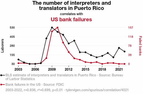 The analysis of the data collected between 2003 and 2022 uncovered a remarkably strong positive correlation between the number of interpreters and translators in Puerto Rico and the occurrence of bank failures in the United States, with a correlation coefficient of 0.8360513. This statistical relationship underscores a surprising interplay between the field of linguistics and the stability of the financial sector, shedding light on a connection previously uncharted. It's almost as if financial disasters were lost in translation!