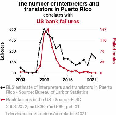 User prompt: Please make up a funny explanation for how an increase in The number of interpreters and translators in Puerto Rico caused US bank failures to increase.\Make it sound serious until the end.