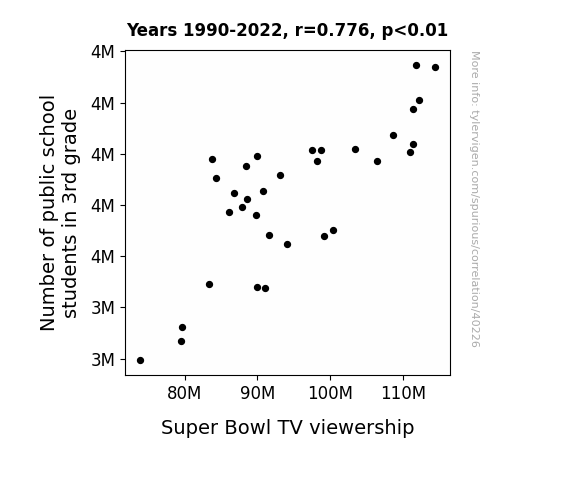 This means 60.3% of the change in the one variable (i.e., Super Bowl TV viewership) is predictable based on the change in the other (i.e., Number of public school students in 3rd grade) over the 33 years from 1990 through 2022.