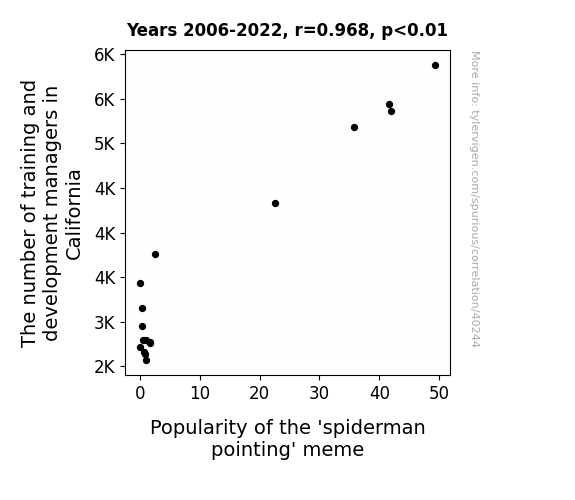 This means 93.7% of the change in the one variable (i.e., Popularity of the 'spiderman pointing' meme) is predictable based on the change in the other (i.e., The number of training and development managers in California) over the 17 years from 2006 through 2022.