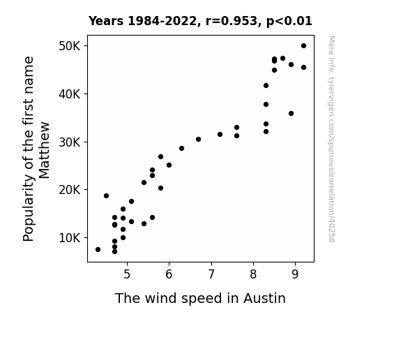 This means 90.9% of the change in the one variable (i.e., The wind speed in Austin) is predictable based on the change in the other (i.e., Popularity of the first name Matthew) over the 39 years from 1984 through 2022.
