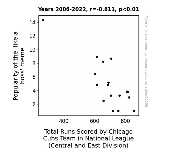 This means 65.7% of the change in the one variable (i.e., Total Runs Scored by Chicago Cubs Team in National League (Central and East Division)) is predictable based on the change in the other (i.e., Popularity of the 'like a boss' meme) over the 17 years from 2006 through 2022.
