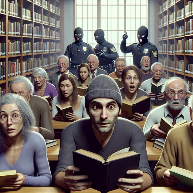 ChatGPT: Prompt: Generate a photo-realistic image depicting a small town library in Maine. Show a group of librarians and library technicians in the background looking surprised and confused, surrounded by stacks of untouched books and empty spaces where stolen books used to be. Show burglars transforming into bookworms, indicating their newfound love for reading. Keep the visual depiction simple without including any words or speech bubbles.