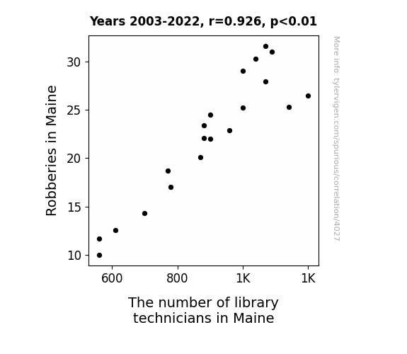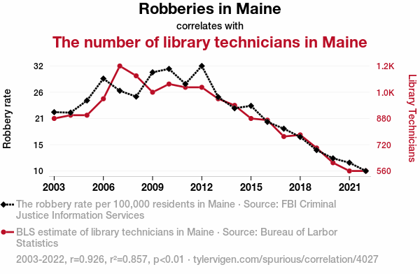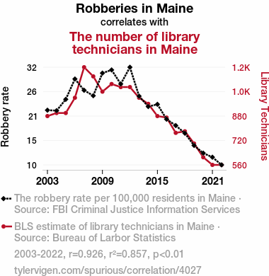 The correlation coefficient of 0.9256215 leaves no room for doubt: there's a strong positive association between the two variables. As the number of library technicians in Maine increased, so did the number of robberies. It's as if the criminals couldn't resist the siren call of the Library of Congress classification system!