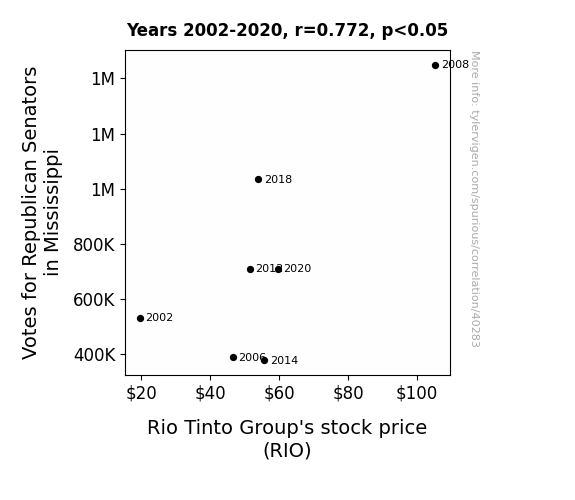 This means 59.7% of the change in the one variable (i.e., Rio Tinto Group's stock price (RIO)) is predictable based on the change in the other (i.e., Votes for Republican Senators in Mississippi) over the 7 years from 2002 through 2020.