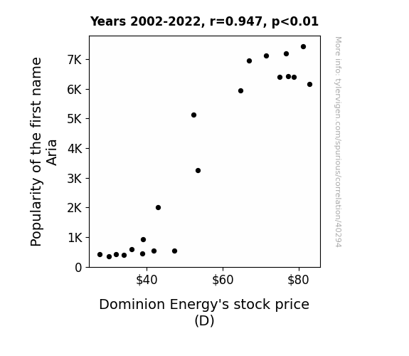 This means 89.7% of the change in the one variable (i.e., Dominion Energy's stock price (D)) is predictable based on the change in the other (i.e., Popularity of the first name Aria) over the 21 years from 2002 through 2022.