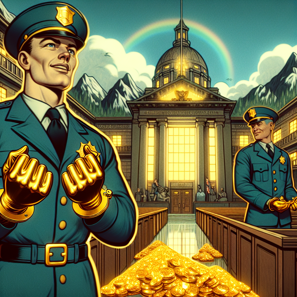 Prompt: An image that looks like a scene from a Disney Movie, but set in a courthouse in West Virginia. Bailiffs are proudly wearing gleaming gold handcuffs, with the price of gold soaring. The courthouse corridors are glistening with the newfound bling, creating a shimmering link between justice and precious metals. The bailiffs are standing proudly, showcasing their gold cuffs, while the courthouse shines with a magical glow of gold. The depiction should include only scenes, people, and objects, it should not include text or speech bubbles.