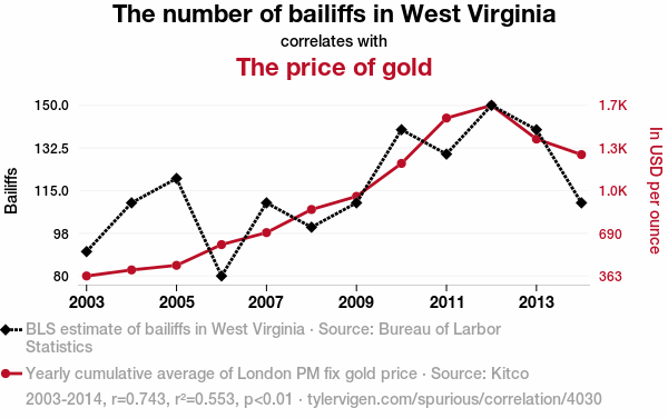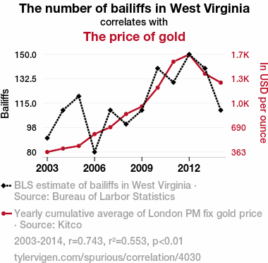 - The spurious research paper: Following the Golden Trail: Exploring the Correlation Between Bailiffs in West Virginia and the Price of Gold