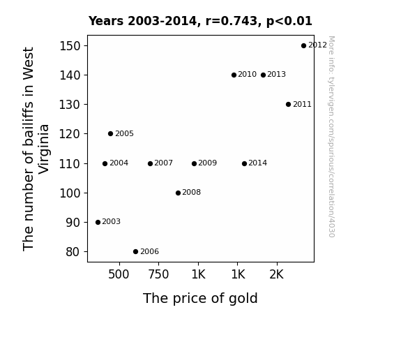 After sifting through mountains of data and braving the statistical jungles, we unearthed a correlation of 0.7433199 between the number of bailiffs in West Virginia and the price of gold for the period of 2003 to 2014. This substantial value of the correlation coefficient suggests a strong relationship between these two seemingly unrelated variables, akin to finding a nugget of truth in the unlikeliest of places.