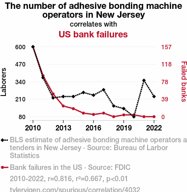 Sticking to the plan, we applied a variety of statistical tests to scrutinize the relationship between the number of adhesive bonding machine operators in New Jersey and the incidence of US bank failures. It was a journey filled with number crunching, chart plotting, and the occasional exclamation of "Eureka!" when a compelling pattern emerged from the statistical jumble. We were on a mission to peel back the layers of economic correlation, armed with a sense of scientific humor to keep our spirits buoyant.