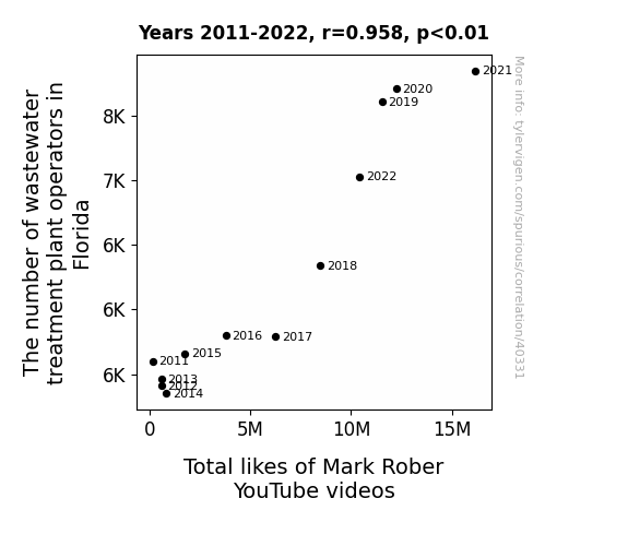 This means 91.8% of the change in the one variable (i.e., Total likes of Mark Rober YouTube videos) is predictable based on the change in the other (i.e., The number of wastewater treatment plant operators in Florida) over the 12 years from 2011 through 2022.