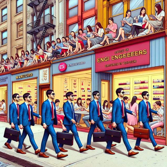 ChatGPT: In a bustling Kansas city, a group of newly graduated engineers proudly display their Master's degrees in Engineering, their precision evident in every aspect of their appearance. As they walk down the street, they pass by a row of vibrant nail salons, each filled with diligent manicurists and pedicurists catering to the growing demand for perfectly manicured nails. The engineers' meticulous attention to detail and the skilled hands of the nail specialists perfectly complement each other, capturing the essence of precision and elegance.