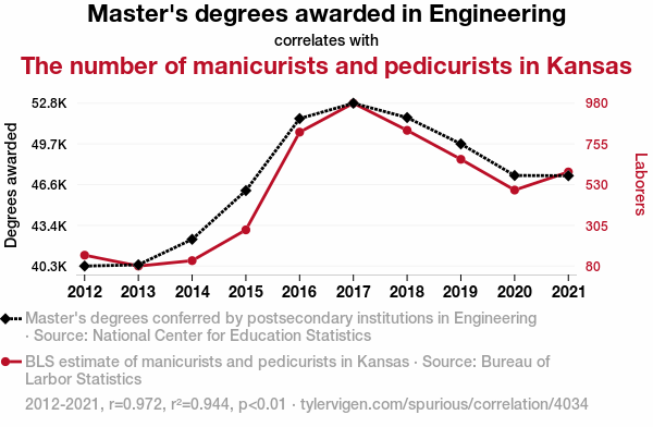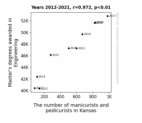 This means 94.4% of the change in the one variable (i.e., The number of manicurists and pedicurists in Kansas) is predictable based on the change in the other (i.e., Master's degrees awarded in Engineering) over the 10 years from 2012 through 2021.