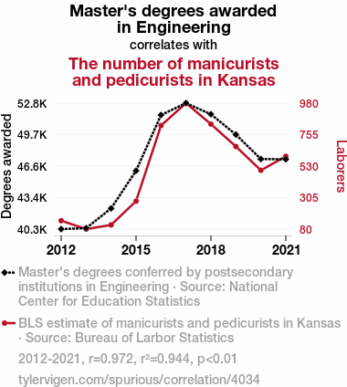 - The spurious research paper: Mastering the Manicure: A Correlational Study of Engineering Master's Degrees and the Manicurist and Pedicurist Workforce in Kansas