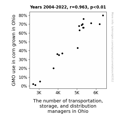 This means 92.7% of the change in the one variable (i.e., The number of transportation, storage, and distribution managers in Ohio) is predictable based on the change in the other (i.e., GMO use in corn grown in Ohio) over the 19 years from 2004 through 2022.