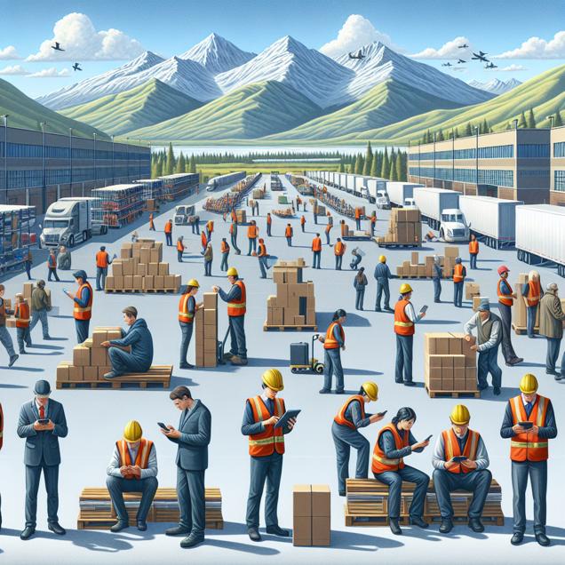 Prompt: In a photorealistic style, depict a bustling distribution center in Idaho, with logisticians actively coordinating the movement of goods. Surround the distribution center with mountains in the background to capture the Idaho landscape. Simultaneously, show individuals on their break, engrossed in their phones, as they search for "who is Alexa," conveying their curiosity about efficient organization. Capture the scene in intricate detail, highlighting the meticulous coordination and the intrigue surrounding modern technology. The depiction should include only scenes, people, and objects, it should not include text or speech bubbles.