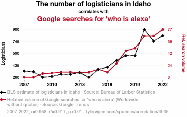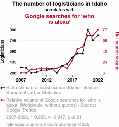 This means 91.7% of the change in the one variable (i.e., Google searches for 'who is alexa') is predictable based on the change in the other (i.e., The number of logisticians in Idaho) over the 16 years from 2007 through 2022.