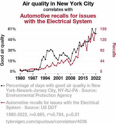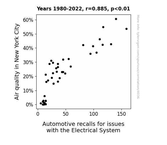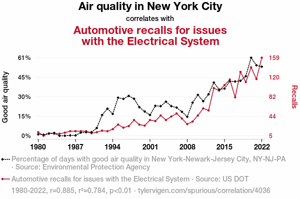 This means 78.4% of the change in the one variable (i.e., Automotive recalls for issues with the Electrical System) is predictable based on the change in the other (i.e., Air quality in New York City) over the 43 years from 1980 through 2022.