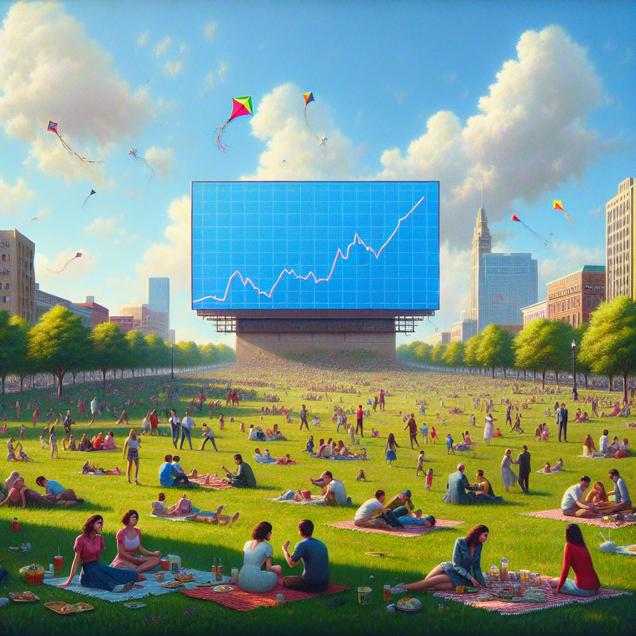 Prompt: Generate an image of a park in Wichita with a hyper-realistic style. In the scene, the sky is a vibrant shade of blue, and the air feels fresh and invigorating. People are casually sprawled out on the lush green grass, engaged in leisurely activities. Children in the distance can be seen excitedly flying kites, their colorful strings trailing behind in the wind. A small group is gathered for a picnic, their spread of food and beverages creating a cozy atmosphere. The focal point of the scene is a large digital billboard displaying a graph illustrating the decline in Google searches for 'Gangnam Style', casting a sense of nostalgia and humor over the setting. The serene and tranquil ambiance of the park captures the essence of relaxation and contentment amidst a dynamic world. The depiction should include only scenes, people, and objects, it should not include text or speech bubbles.