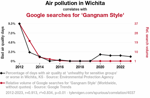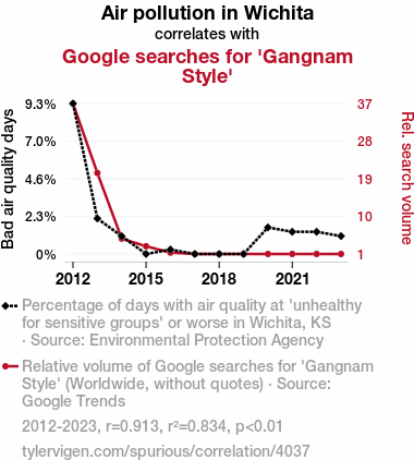 - The spurious research paper: Uncovering the Rhythmic Connection: Air Pollution and Google Searches for 'Gangnam Style' in Wichita