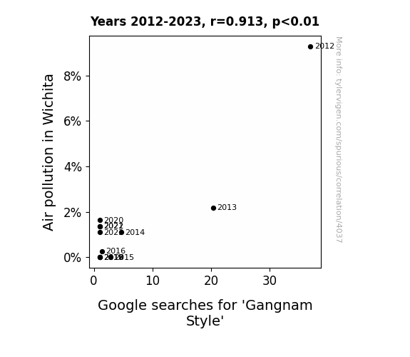 This means 83.4% of the change in the one variable (i.e., Google searches for 'Gangnam Style') is predictable based on the change in the other (i.e., Air pollution in Wichita) over the 12 years from 2012 through 2023.