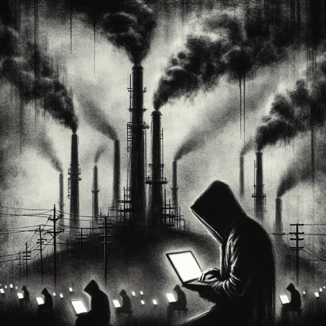 ChatGPT: Transform this scene into a haunting black and white charcoal sketch that captures the ominous atmosphere of Butte, Montana. The smokestacks should be towering, emitting billows of toxic fumes that blend into the hazy sky. A sense of dread should permeate the scene as silhouetted figures are depicted typing frantically in the dimly lit glow of their electronic devices, alluding to the sinister online searches. Capture the eerie juxtaposition of industrial pollution and hidden secrets in a stark and chilling composition.