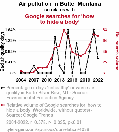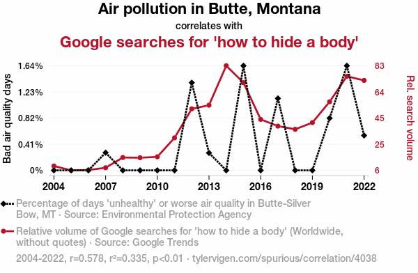 - The spurious research paper: The Polluted Plot: A Correlation Between Air Quality in Butte, Montana and Online Searches for 'How to Hide a Body'