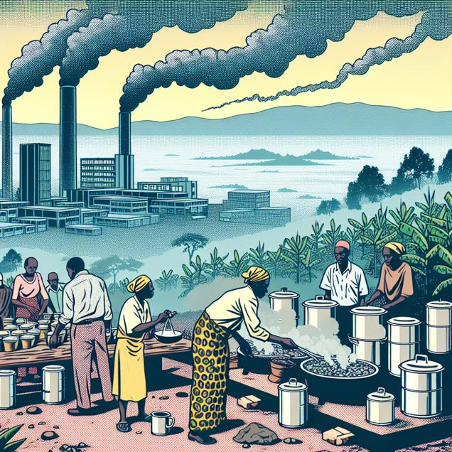 Prompt: Generate a comic-book-style illustration with muted colors and a dotted halftone pattern from the 1960s. Depict a hazy sky over Seneca, South Carolina, with smog hanging heavy in the air. In the midst of this, show people in Rwanda transitioning from traditional cooking methods to using clean-burning liquefied petroleum gas. Emphasize the contrast between the polluted air in Seneca and the transition to cleaner fuel in Rwanda, to tell the story of interconnected global environmental impacts. The depiction should include only scenes, people, and objects, it should not include text or speech bubbles.
